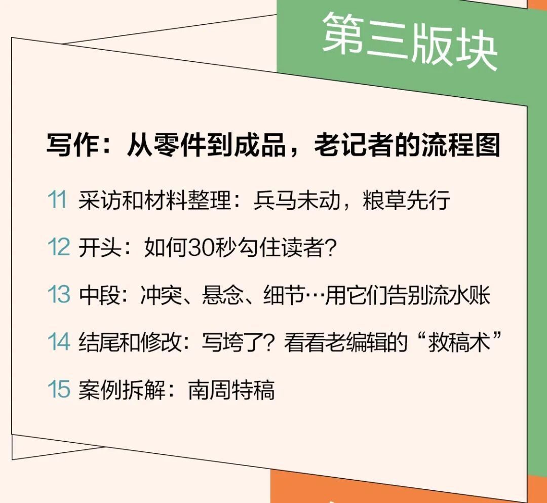 第三版块,我们从记者的流程图开始,从零件到成品,学习怎么将日常的积累与素材,变成作文的材料。再从开头、中段、结尾以及修改,一一讲解好文章是怎么写出来的。
